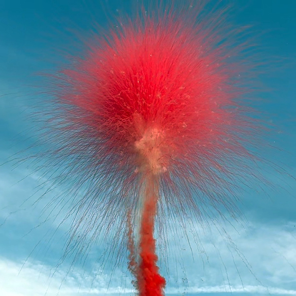 Огромный дымный цветок красного цвета в серебряном мерцании.